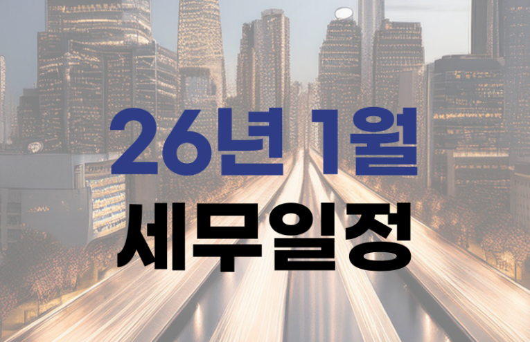 안녕하세요. 대표님의 든든한 절세 파트너 세무법인 가치입니다. 오늘은 2026년 1월 세무 일정을 알려드리려고 합니다. 📣2026.01.12 (월) 🔹원천징수분 법인세·소득세·지방소득세[소득분] 납부 (2025년 12월분) 🔹소규모사업자 등 원천세 반기별 납부 (2025년 7~12월분) 🔹증권거래세 신고납부[전자등록기관 등 금융투자업자] (2025년 12월분) 🔹레저세[농특세·지방교육세 포함] 신고 납부, 주민세[종업원분] 신고납부 (2025년 12월분) 🔹국민연금·건강·고용·산재보험료 납부 📣 2026.01.15 (목) 🔹고용·산재보험 근로내용 확인 신고 📣 2026.01.20 (화) 🔹담배소비세[지방교육세 […]